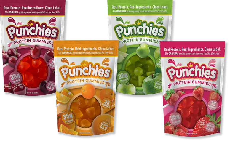 Protein gummies or protein-infused fruit snacks that make protein fun and appealing to kids. Punchies is the first of its kind with a mission to help kids get enough protein in their diets in a format they love and will eat. These are a familiar candy-like format (gummies or fruit chews) and incorporate protein (whey and collagen based are best) so that each serving provides a few grams of protein. For instance, Punchies protein gummies provides 5 grams of protein per serving, compared to regular fruit snacks that have 0 grams.