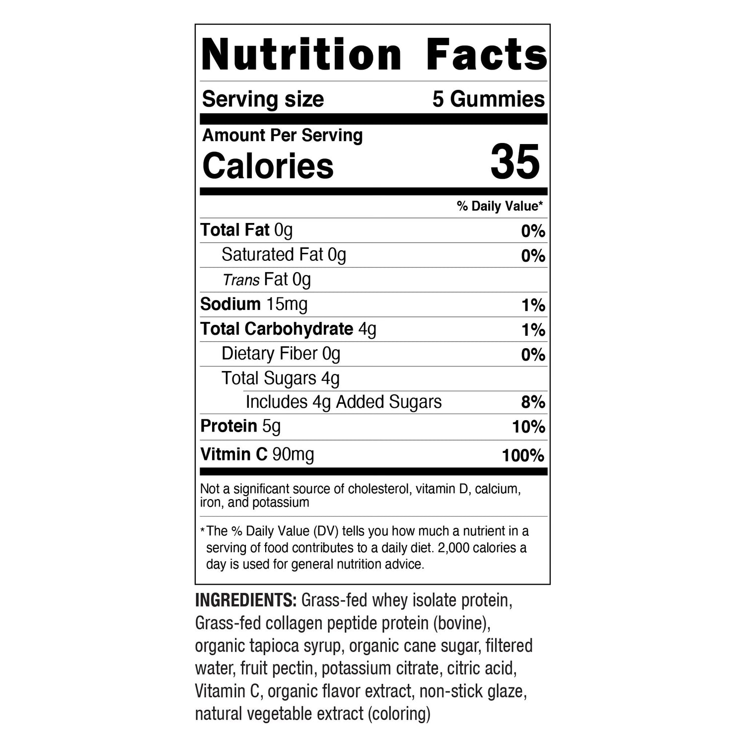 A: Every serving (5 protein gummies) delivers 5g of complete protein (as much as an egg) and 100% Vitamin C. A perfect snack anytime for growing kids.